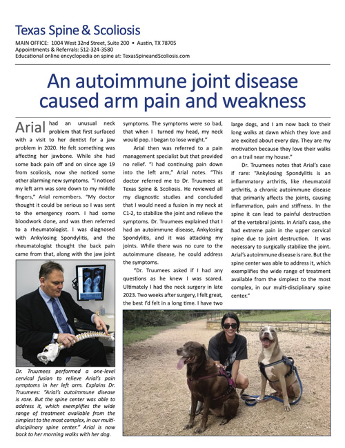 Arial then was referred to a pain management specialist but that provided no relief. “I had continuing pain down into the left arm,” Arial notes. “This doctor referred me to Dr. Truumees at Texas Spine & Scoliosis. He reviewed all my diagnostic studies and concluded that I would need a fusion in my neck at C1-2, to stabilize the joint and relieve the symptoms. Dr. Truumees explained that I had an autoimmune disease, Ankylosing Spondylitis, and it was attacking my joints. While there was no cure to the autoimmune disease, he could address the symptoms.