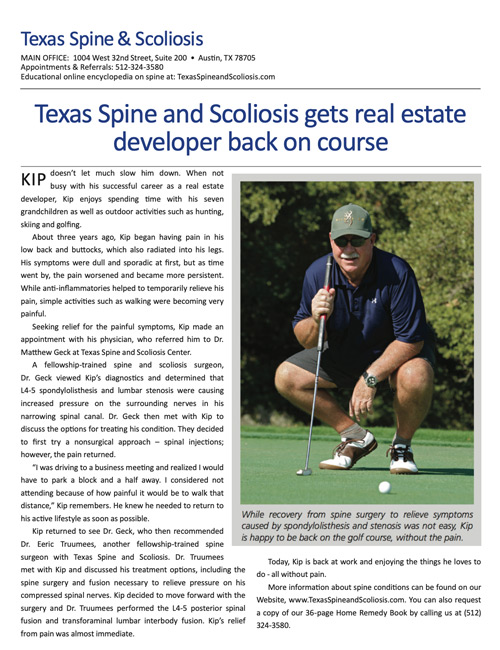 Seeking relief for the painful symptoms, Kip made an appointment with his physician, who referred him to Dr. Matthew Geck at Texas Spine and Scoliosis.